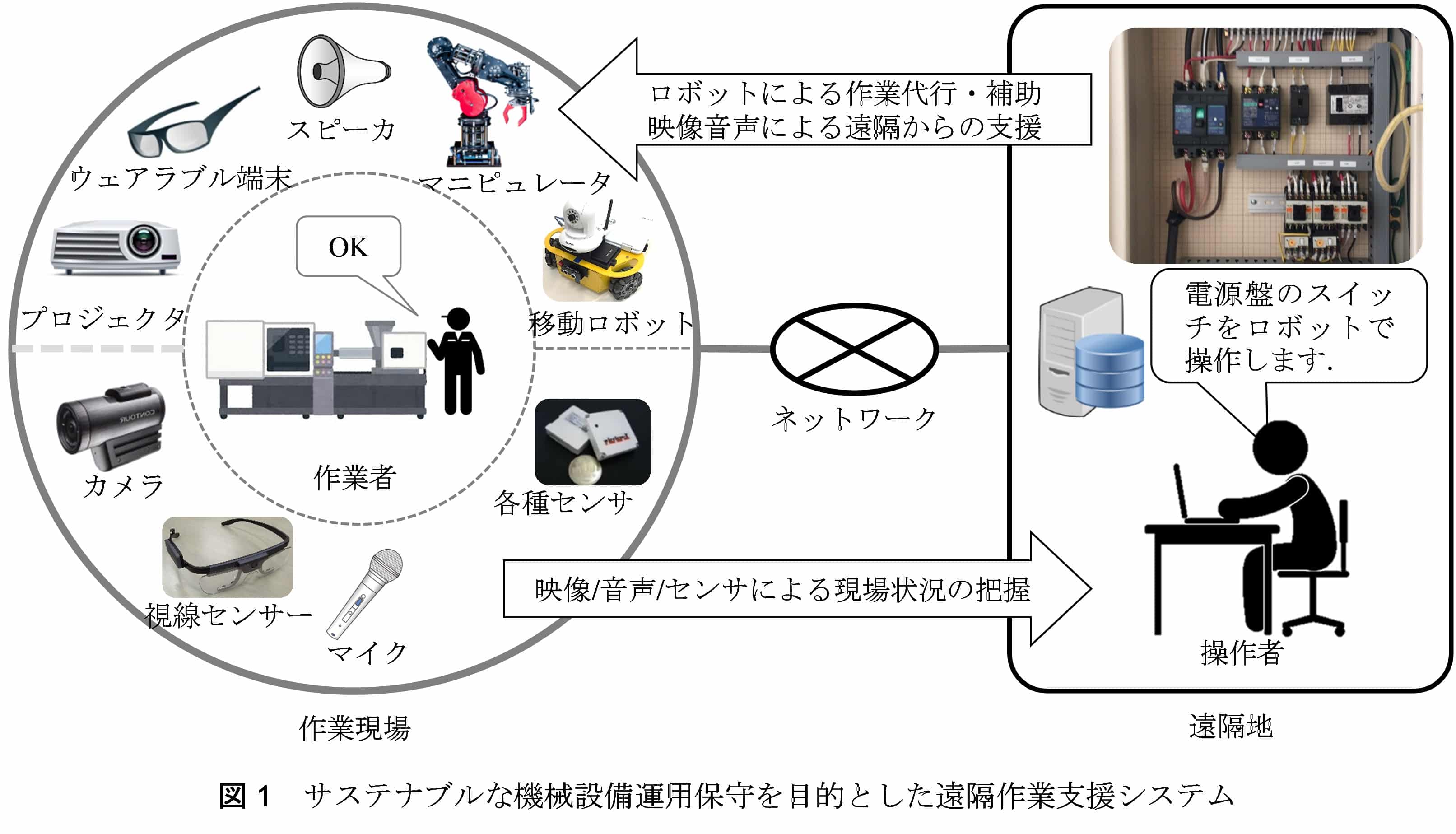 記事では、持続可能な機械システムの実現を目的に研究開発を進めてきた遠隔作業支援システムを紹介する。まず、システム全体の構成と概要を説明し、次に具体的な例として、遠隔点検を目的とした移動ロボットシステムと、遠隔操作マニピュレータの操作インタフェースの構築例について解説する。
